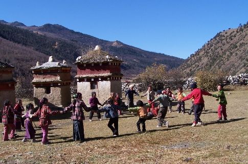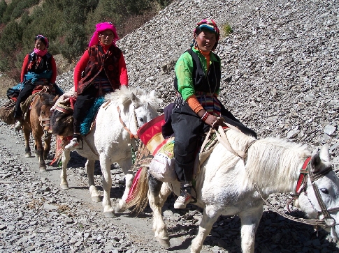 Údolí pod klášterem je značně široké, ploché jako fotbalové hřiště, uprostřed tiše meandruje tyrkysová říčka. Nad hlavami vlevo se zvedá zaledněný Genyen, opodál ostrý Sachun. Chodníček na dně údolí velmi pozvolna nabírá výšku. Na dně údolí jsou rozesety četné připomínky buddhistické víry v podobě ornamentů vypálených nebo vyražených do kamene, modlitebních kamenů a barevných praporků potrhaných větrem.