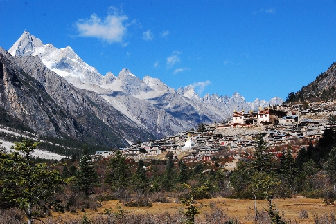 Kde je ona fádnost krajiny, kterou jsme se sem busem a nyní autem trmáceli!? Před námi ční zubaté vrcholky pokryté ledem, lesy a loukami hrajícími odstíny zelené. Scenérie je tak dramatická a úchvatná, že se nemůžeme nabažit a pohled odvrátit jinam! Celé skupině kralují dva vrcholy. Úplně nalevo Genyen a uprostřed dechberoucí skalní pyramida Cameron (5.873 m n. m.).