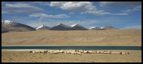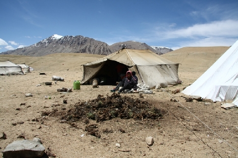 Zhruba po dvou hodinách poměrně pohodlné cesty dopravní prostředek vpluje do údolí, jež se nám hned v prvních vteřinách ukáže v celé své kráse. Víříme písečný povrch a přibližujeme se k bílým tečkám, nomádským stanům. Bezejmenné jezero je ze všech stran obklopeno horami, jejichž vrcholky pokrývá sníh. Aby ne. Právě se pohybujeme ve výšce 4700 m.n.m. Modrá hladina jezera si je své krásy vědoma a proto vysílá odlesky, jež nelze přehlédnout. Vyžraná místa v zemi naznačují, že i zde býval plácek vhodný pro pastvu.