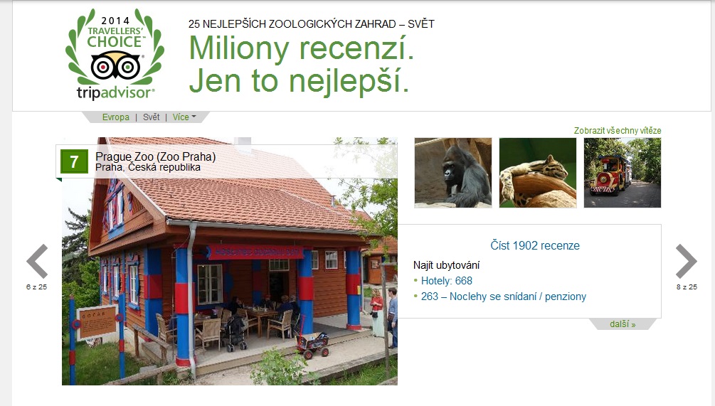Tripadvisor je nezávislý server, který pomáhá hlavně cestovatelům. A ti zároveň spoluvytvářejí jeho obsah. Dozvíte se zde informace o ubytování, můžete si prohlížet fotografie nebo číst uživatelské recenze. Pro rok 2014 jsou známé výsledky i v dalších kategoriích – Hotely, Hotely se špičkovými službami, Destinace, Pláže, Ostrovy a právě nej zoologické zahrady, kde tak zazářila Zoo Praha. Pokud se chcete řídit tipy z tripAdvisoru, měli byste letošní dovolenou strávit v Istanbulu (nejlepší destinace), vyrazit na nejkrásnější ostrov Lewis and Harris nebo se slunit na top pláži Rabbit Beach na Sicílii.